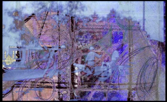 After working with a variety of sources for my Memory Passages video series I began to inspect the still images that were created. The collection of images functions as a reminder or travelogue of my journeys, but also as a set of collage material generated first by chance than by way of my selection. Over the course of 2012 (and beyond) I will be distributing these one of a kind images for free.